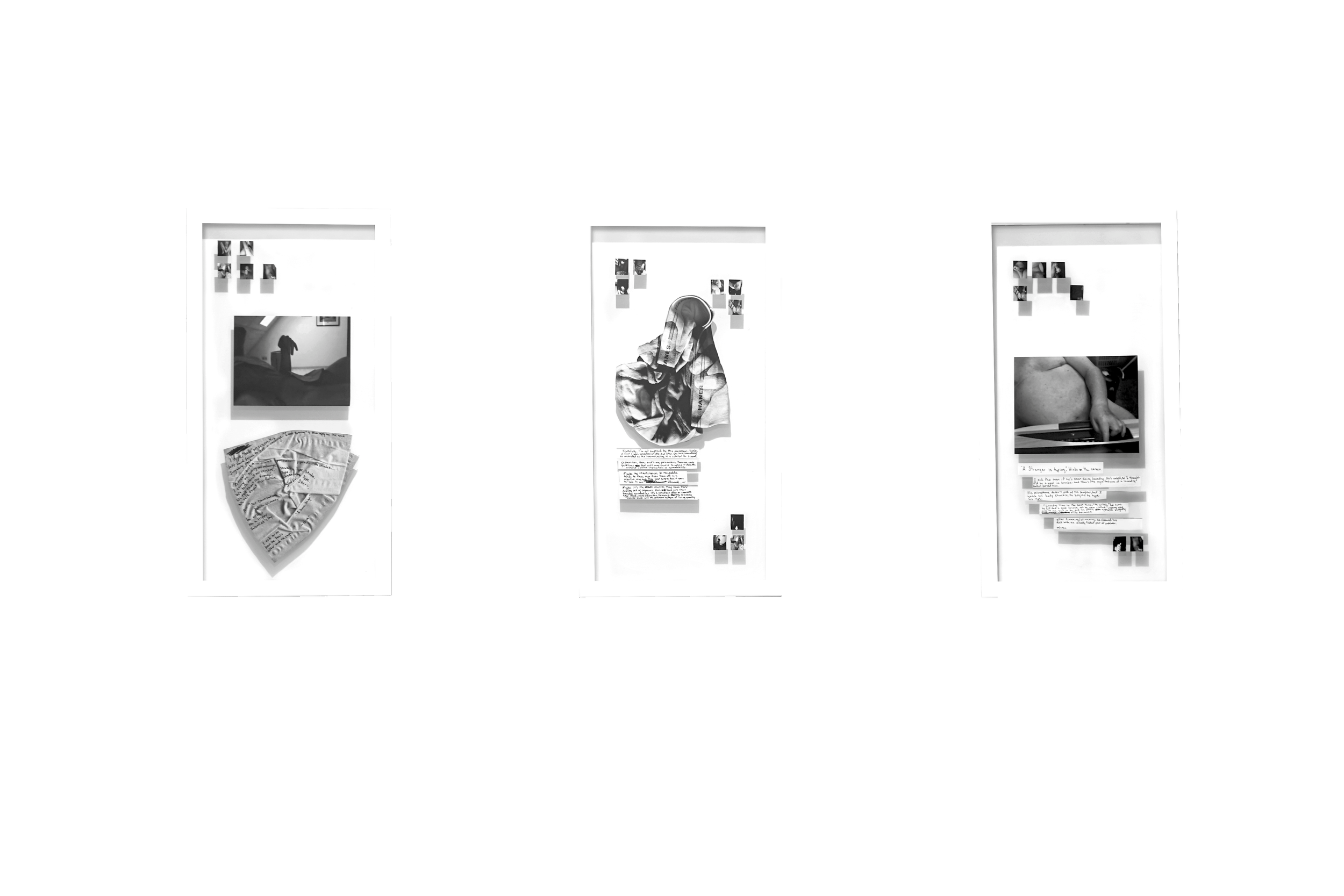 I wanted to have conversations with people from the comfort of my bedroom. Digital technology has afforded this comfort and its users are uninhibited. During my conversations with people online, I would come across a population of men openly masturbating. Instead of skipping over them (the option many of which take), I decided to document, ask questions, and grasp a general consensus of understanding from a female perspective. The work incorporates photography and sculpture to better explore the three pivotal exchanges that happen during each encounter; conversation, climax, and aftermath as a landscape. Conversations with the men were documented while on the verge of climax. Articles of donated clothing were scanned and exhibited to address the variety of items used during orgasm. The provisional sculpture demonstrates the landscape of these items once discarded and functions as an expressive gesture to represent the declining physical transition between orgasm and aftermath.